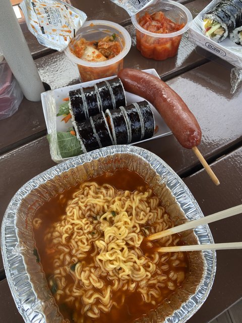진짜 날 좋은 날에 야외에서 라면 먹는거 진짜 최고지 않ㄴ냐 바람은 살랑살랑 불고 날씨 좋규 라면은 뜨끈 매콤하고 김밥에 소세지랑 김치까지 금상첨화 ㅠㅠ