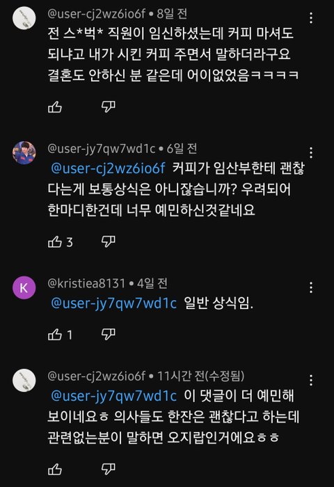 별게 다 불편하네 걱정돼서 물어볼 수도있지.혹시 디카페인으로 시키려는걸 잘못시킨게 아닐까하고 얘기 할 수도있는거지. 임산부가 커피마신다고 알바가 욕을하길했어 못준다고 얘길했어? 심신이 꼬였나 ㅠ