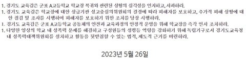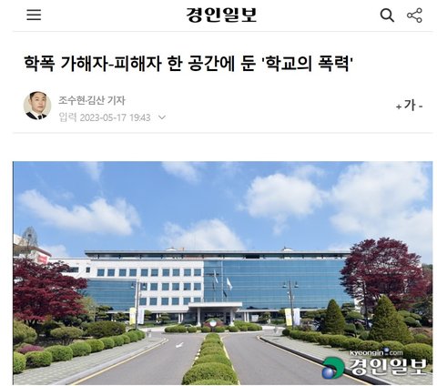 -경인일보(교사 폭행한 교장 직위해제 풀려… 학교 돌아와 함께 근무하는 '촌극' 23.5.8.)http://m.kyeongin.com/view.php?key=20230508010001414-경인일보(학폭 가해자-피해자 한 공간에 둔 '학교의 폭력' 23.5.17.)http://m.kyeongin.com/view.php?key=20230512010002395-경인일보([토론합시다] 돌아온 '학폭교장' 막을 法 없는데… 경기도교육청은 '뒷짐만' 23.5.21.)http://www.kyeongin.com/main/view.php?key=20230521010003651-전교조 성명 보도자료(경기도 교육감은 가해 교장 비호를 중단하고, 학교 정상화를 위한 책임 있는 행동을 당장 시작하라. 23.5.26.)https://chamkk.eduhope.net/bbs/board.php?bo_table=maybbs_c_2&wr_id=35933&menu_id=30-경기일보(단톡방 사건’ 군포 A고교 이번엔…교장이 여교사 강제추행 ‘구설수’ 22.8.25.)https://scsgozneamae10236445.cdn.ntruss.com/data2/content/pdf/20220826/00401010101.pdf