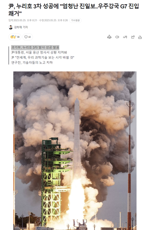 [파이낸셜뉴스] 한국형 발사체 누리호의 3차 발사가 25일 성공한 것과 관련, 윤석열 대통령은 "우리나라가 우주강국 G7에 들어갔음을 선언하는 쾌거"라고 강조했다.