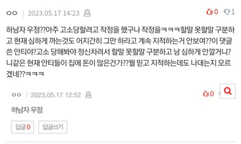 저거 되게 일부임 진심 한두개도 아니고 먹금할글에 먹금도 못하고 댓글 도배하질 않나 현재글 올라오면 저사람 댓글 최소 5개씩은 있어