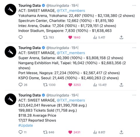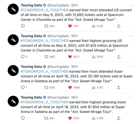 미국에서 아레나이상 도는 가수들 거의 손에 꼽히는데 대댄한 기록중인건 맞는거 아닌가? 작년에 첫 투어 시작한걸로 아는데 1년사이에 겁나 성장해서 놀랍다 롤라팔루자도 작년에 첫 데뷔였는데 올해는 90분이나 공연하는 해드라이너로 성장했고!! 7월에는 쿄세라 돔도 가고 투바투 성장 놀라워 투바투 꼭 더 흥해라