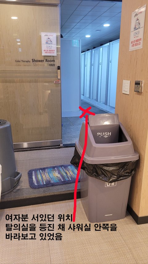 제가 탈의실에서 옷을 벗을 때 탈의실 안에는 다른 사람들도 있었고, 샤워실에 들어가기 직전에도 다른 여자분이 제 옆으로 지나갔기 때문에 안에 남자분이 있을 거라는 상상조차 하지 못했습니다. 탈의실과 샤워실은 연결되어 있고, 샤워실 문(유리로 된 자동문이나 항상 열려있음) 바로 앞쪽에 머리를 말리는 공간이 있는데 보통 사람들이 옷을 벗은 채로 드라이기를 사용합니다. 샤워실 안에 있는 사람이 고개만 돌리면 탈의실이 보이는 구조이기 때문에 탈의실에 들어가기 전에 안에 남자분이 있다고 안내를 하는 게 당연한 거라고 생각합니다. 이해를 위해 샤워실 구조를 찍은 사진을 아래 첨부합니다. 사진은 어제 사건 발생 후, 사람이 없는 걸 확인 후에 찍은 사진입니다.