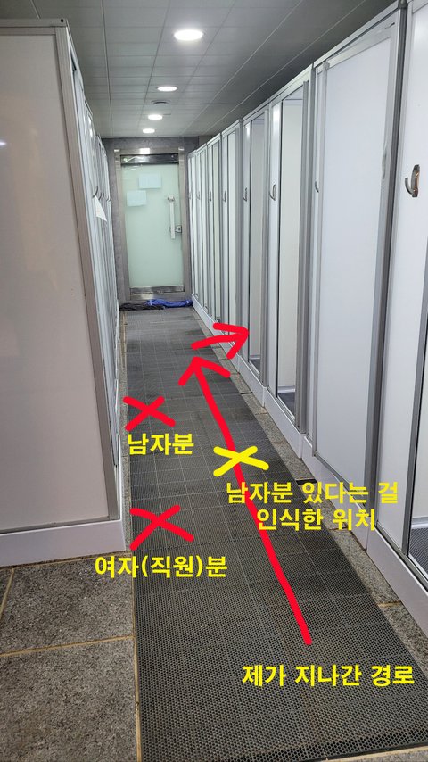 +) 남자분을 보고도 그 옆을 왜 지나갔냐 하시는데... 샤워실에 들어갈 때 여자분에 가려서 남자분이 있는 줄 몰랐고, 샤워실에서 다들 알몸으로 다니는데 굳이 샤워실에서 마주치는 사람 쳐다보고 다니지 않습니다. 평소에 샤워실 안쪽에 있는 샤워부스를 이용해서 안쪽으로 들어가는 중에 여자분 뒷모습을 봤고, 시설점검하나보다 하면서 계속 걸어가는데 남자분을 마주친겁니다. 안쪽으로 계속 걸어가던 중이었고 얼른 몸을 가려야겠다는 생각에 남자분을 지나쳐서 앞에 있는 샤워부스로 급하게 들어간 거고요. 사진으로 봐도 여자분, 남자분, 제가 들어간 샤워부스 굉장히 가까운 거리에 있고 제가 남자분 발견하고 샤워부스에 들어가기까지 짧은 시간이었습니다.