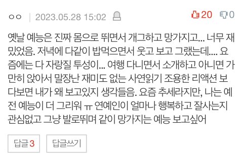 예전에는 몸소 뛰어다니면서 망가지고 시청자들과 공존하는 느낌이 있었는데