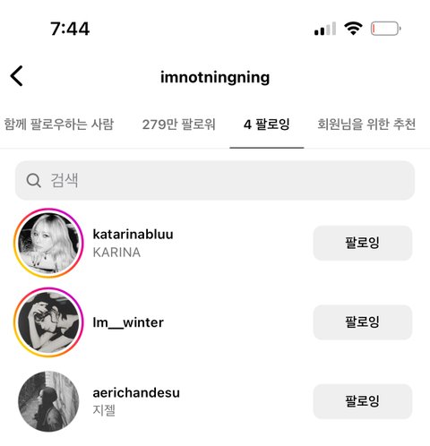 파란 딱지 없음?? 카리나 윈터 지젤 닝닝 다 없음… 우ㅜㄴ래 연예인들 다 있는거 아닌가..?필로워 1만미만 듣보 인플루언서들도 요즘은 다 있던데 에스파가 없다니 ㄷㄷ