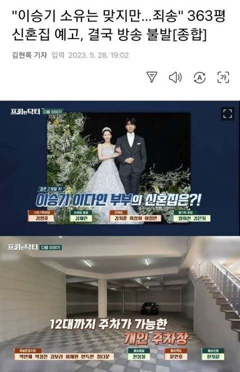 저거 2년전에 이승기가 1인 소속사 한다고 샀던 건물이고 다시 후크로 돌아간다고 매매 내놓았는데 안팔려서 현재 임대 내놓고 있음 이승기는 저기 안사는데 저 건물을 신혼집이라고 허위방송해서 방송 안한다고 한거고 저건 방송사가 사실 확인 안하고 허위방송해서 사과한다는 기사인데 왜 이승기탓을함