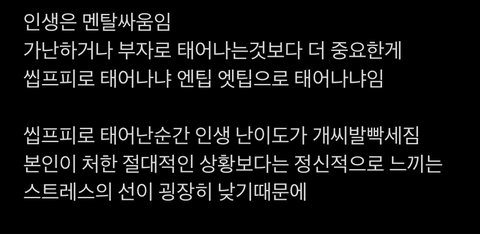 엠비티아이로 딱잘라서 말하긴 어렵긴한데 진짜 내가 딱 저렇게 스트레스 역치가 개낮은 사람이라 진짜 힘듦 사소한 감정에 좌우되고 그것때문에 시간낭비 정신력소비 심함…