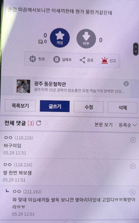 제목 본 그대로야 ㅠㅠ 오늘 남자친구 몰래 휴대폰을 뒤지다가 최근 접속한 사이트 목록에 디시인사이드가 뜨길래 몰래 봤더니 무슨 최근에 올린 글은 벌레 질문이긴 한데 ㅠㅠ 말투도 그렇구 조금 쎄한거 같은데 언니들 생각은 어때? 조언좀 부탁해 ㅠㅠ... 실제로 디시 막 하는 사람은 처음봐서 ㅠㅠ 매일 말투 장난이긴한데 ~했노 이러고 맨날 나 장난식으로 도촬하는데 찍힌 사진들 보면 손가락으로 ㅇㅂ인증 모양도 같이 찍히게 하구... 장난인줄만 알았는데 기분이 이상해 어떻게 해야할까? ㅠㅠㅠ 너무 혼란스럽다