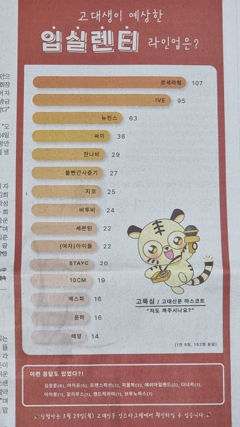 좋아하는 그룹 투표가 아니라 축제 올거같은 예상그룹 투표잖아 ㅋㅋ 에스파는 작년에 이미 왔었으니까 그런거고 ㅋㅋㅋㅋㅋㅋ