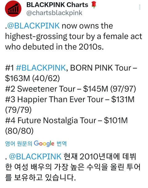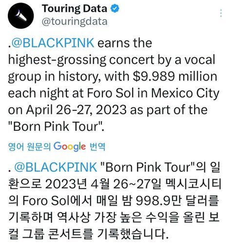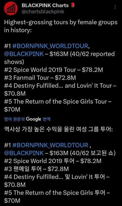 스파이스 걸스 기록을 깨고 역사상 최다 수익을 올린 걸그룹 투어 등극