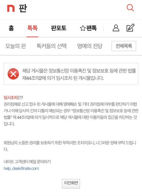 저번주에 올라온 백현 루머 까글 권리침해 임시조치 당함 어제까진 들어갈 수 있었던 거 같은데 글이랑 베댓 다 ㄹㅇ ㅈ된듯