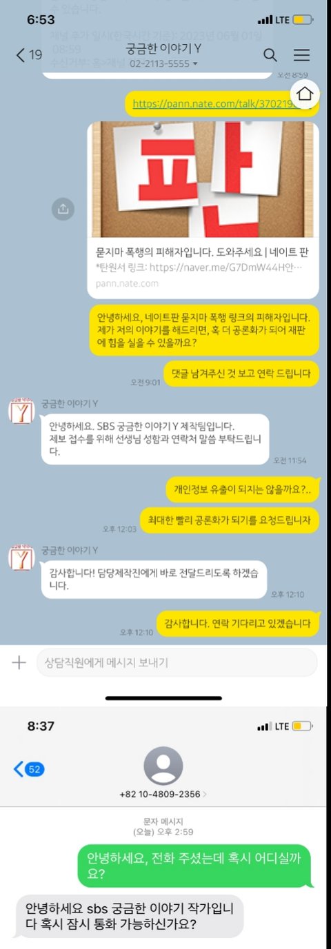 + 그래도 인증 사진 하나는 올려야 할 것 같아 궁금한 이야기y 제작진과 연락하고 취재 준비하는 내용과 청원24에 신청한 내용을 올려드립니다. (작가님 번호는 댓글에도 공개되어 있어 모자이크 하지 않았습니다. 문자 일부만 보여드린 것은 지극히 개인적인 사건내용이라 올리지 않았습니다)