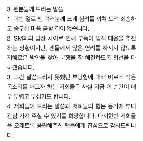 근데 수호가 라스에서 언급하길, 예전부터 멤버들이랑 재계약 얘기 엄청 많이 했었는데 결론은 “어딜 가든 다같이 가자”였다고 했음. 다같이 스엠에 남거나, 레이블 차려 나가거나, 다른 소속사 가거나 셋 중 하나라고 ㅇㅇ 난 그래서 이게 비단 첸백시만의 의견은 아닐거라 생각함. 팬이면 알텐데 멤버들 전부 “엑소”를 가장 우선시하고 있고, 그중에서 홀로서기 제일 성공한 경수랑 백현도 ‘그 무엇보다도 엑소가 가장 우선이다’를 무수히 언급해왔음. 애들 버블 보면 요즘 저녁에 계속 같이 모여서 연습했던 것 같은데, 과연 이 얘기가 안 나왔을까 싶음. 내가 볼 땐 엑소 전부 비슷한 입장임.