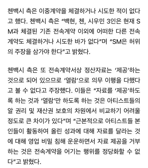 첸백시 측은 “백현, 첸, 시우민 3인은 현재 SM과 체결된 기존 전속계약 이외에 어떠한 다른 전속계약도 체결하거나 시도한 바가 없다”며 “SM은 허위의 주장을 삼가야 한다”고 밝혔다.