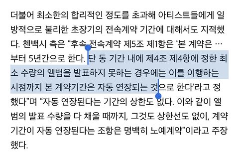 그리고 기존 전속계약이 1년 여나 남은 시점에 미리 이렇게 장기간인데다가 기간의 상한도없는 후속 전속계약을 체결하여 두어 아티스트들을 ‘묶어’ 두려는 행위도 정당하다고 볼 수 없습니다. SM은 아티스트들에게 후속 전속계약에 대한 계약금도 지급한 바가 없습니다. 이와 같이 장기간인 기존 전속계약 및 불공정한 후속 전속계약서 체결 행위에 대해, 백현, 시우민, 첸은 공정거래위원회에 대하여 제소하는 방안을 심각하게 검토하고 있습니다. ] 기사 본문