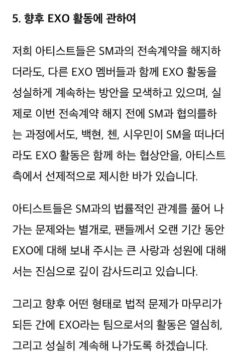 (첸백시는 심지어 기사내기 전에 최대한 협의하자고 제시했다고 하고ㅇㅇ 이젠 결과가 어떻든 앞으로 엑소 활동 최선을 다 할 거라고 함)