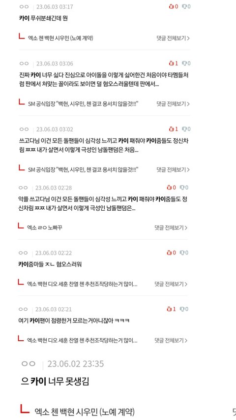도대체 카이애미들은 왜저렇게 열등감 심해? 백현 군대가있어도 열폭하고 디오 연기활동 잘하니깐 못생겼다고 까글쓰고 백현컴백글까지 악플도배하면서 자기 최애는 솔로 말아먹어서 견제없으니깐 판남신수준으로 올려치기당하는데 한을 왜 처먹어