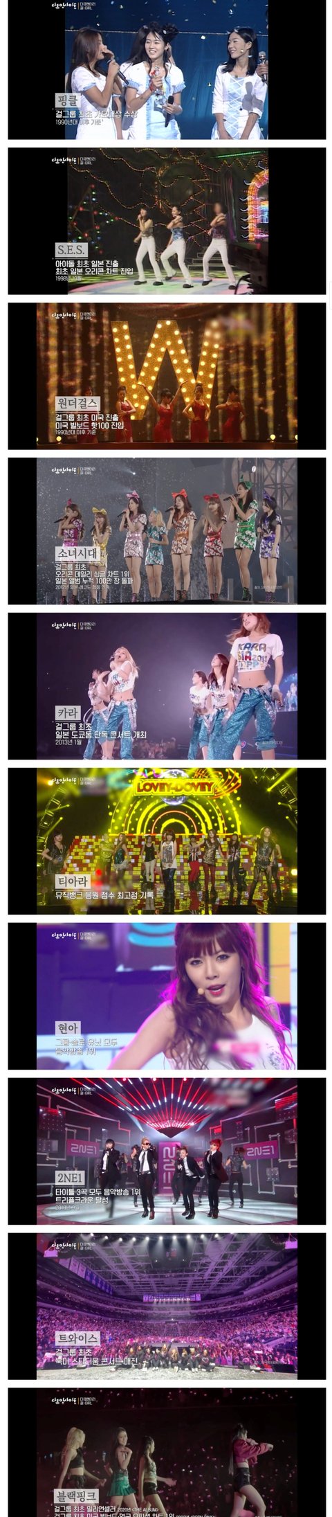 1세대 : 핑클 SES2세대 : 원더걸스 소녀시대 카라2.5세대 : 티아라 현아 2NE13세대 : 트와이스 블랙핑크