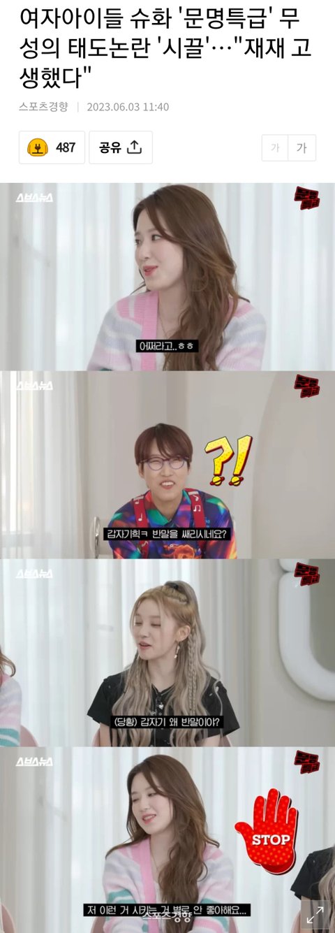 여기 댓글들 다 감싸주는거 뭐임? 아니 그룹활동 1개월차도 아니고 지금 몇년짼데 존댓말 안하는건 문제가 있는게 당연한거지. 게다가 그룹 안에 지금 외국인멤버가 자기 하나도 아니고 우기랑 민니는 존댓말 잘만 하고 논란 되지도 않는데 한사람만 맨날 논란이 되면 좀 자기도 신경을 써야하는거 아님? 그리고 중국인 타령하는데 우기도 중국 국적 아님? 참나 쉴드도 정도껏 쳐줘야지 누가봐도 잘못된걸 지적해도 팬들이 안티 타령만 해대니 계속 자기 잘못도 모르고 개선이 안되지..