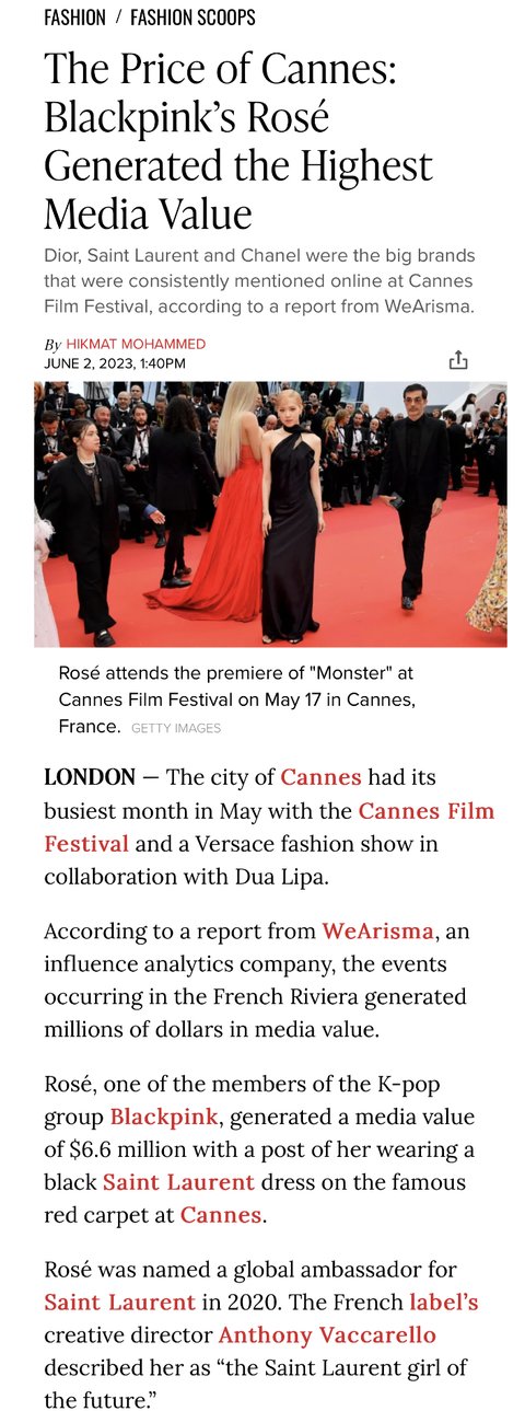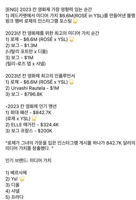 블랙핑크의 멤버 중 한 명인 로제는 칸 영화제에서 유명한 레드 카펫에서 검은색 생로랑 드레스를 입은 사진을 올리며 660만 달러의 미디어 가치를 창출했어.