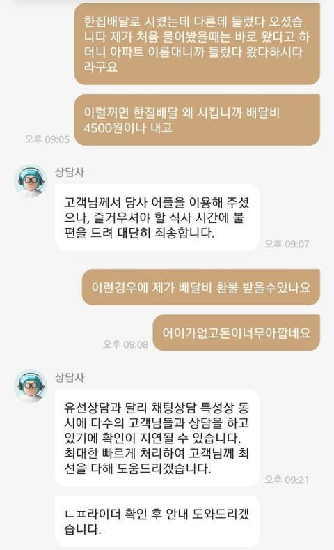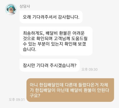 아니 한집배달이 아닌데 한집배달 이용료 받아가면서 환불이 안된다는게 말인가? 저러고 나서 이후로 대답없음ㅎ
