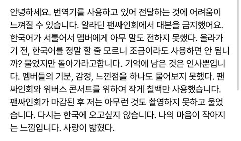 팬싸 한국엔진 비율 줄이고 외국엔진 더 받아놓고 포스트잇, 대본, ps 현장에서 갑자기 금지해서 돈 700 쓰고 하고싶은 말도 제대로 못함 다시는 한국에 오고싶지 않다는 말 개안타까움