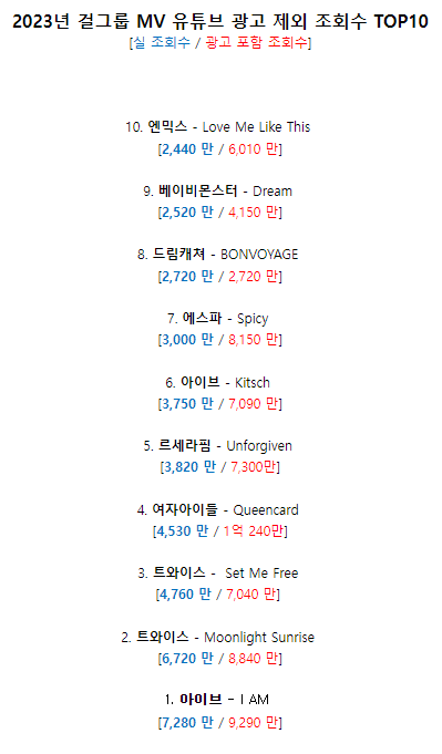 엔믹스, 베이비몬스터, 드림캐쳐, 에스파, 아이브, 르세라핌, 트와이스