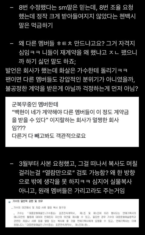 ⭕️ 베플 진짜 왜 그래..? 제발 입장문 좀 제대로 읽어요^^ 스엠은 처음 입장문에서 그동안 "열람"만 가능했다고 써있어요^^; 기밀유지서약서는 원래는 없었구요; 너 왜 댓글 수정하니? 기밀유지서약서 쓰면 이라며ㅋㅋ; 그리고 열람만 가능했던 건 팩트야; 니가 추가한 사진에서 "사본 제공하겠다고 했다"는 말이 어딨는데? ㅋㅋㅋㅋㅋ 그래서 이번에 새롭게 낸 입장문에서 원래 안 이러는데~ 기밀유지서약서 만들어서 결국 쓰고 사본 제공한다잖아;