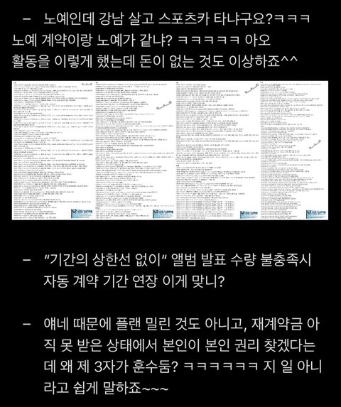+++ ⭕️ 댓쓰니야 "협박" 받은 척 이라는데 "압박"이라 했어 (둘의 차이는 알지? ) 그리고 회사가 말했는데 스엠에 따져; 왜 2명 재계약 해놓고 멤버들 계약금 걸고 넘어졌냐고;; 들은 사람한테 뭐라하네ㅋㅋ 이게 너네의 이중성이라고; 그리고 남은 멤버들 계약은 계약도 아님? 스엠이 반박문 아직 안 올렸으니까 또 뜨고 나중에 양측 다 보면 알겠지; 솔까 니가 당사자임? 계약 상황을 어떻게 아는데 ㅋㅋㅋㅋㅋㅋㅋㅋㅋㅋㅋ 여론몰이는 너네가 하고 있어 익명 글 가져오고 추측하면서~