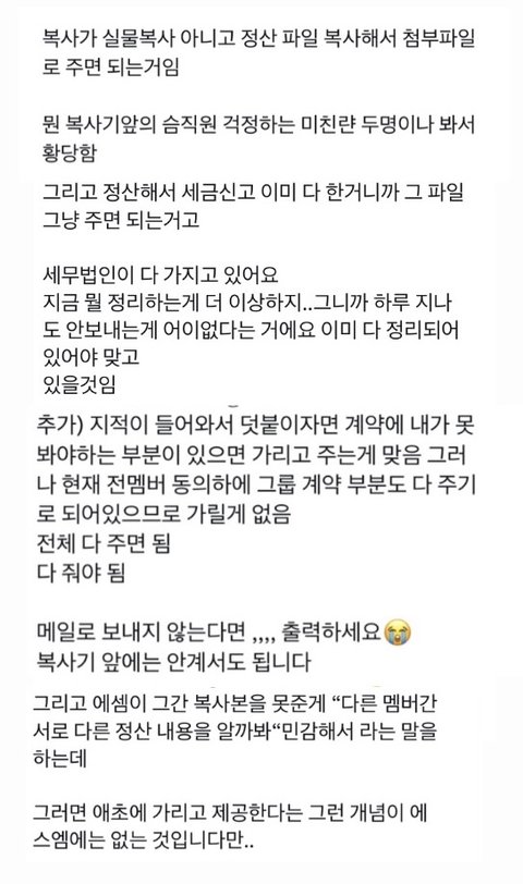 + 추가 ㅋㅋ 하두 스엠 직원 빙의해서 복사 타령하는데 니네가 말하는 복사도 아니야ㅋㅋ 당연한 걸 선심 쓰듯 말하는 스엠에 넘어가기~ 멤버 빙의해서 불쌍하다 이러는데 원래 멤버는 가려서 주는거임; 그리고 베플아 기사 좀 읽어; 1차 전문에서 스엠은 그동안 "열람"만 가능하게 했다고함;