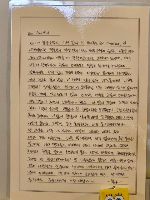 웅재가 쓴 것도 있는데 눈물 밖에 안났어...승관이랑 빈이랑 늘 그랬듯 싸웠을 때 웅재가 "싸우지마 얘들아 난 너희 뿐이야" 그렇게 말했다는 거랑 사랑한만큼 아프다면 평생 아파도 좋다고 한거 보니까 빈이를 많이 많이 사랑했고 지금도 많이 아끼구나 하는 생각이 들었어...저기 위에 승관이가 쓴거에서도 빈이 없이 괜찮은 것보다 차라리 덜 괜찮은게 낫다고 한 것도 그렇고....나도 다른 사람한테 저렇게 따뜻한 사람이었나 돌아보게 되더라...내 자랑하고 가진 거 잘난 척하는 사람이 아니라 내 것을 더 많이 나눠주고 힘들 때 따뜻함을 건네줄 수 있는 사람이 되어야겠다는 생각이 들었어...아휴 난 아직도 여전히 마음이 아프고 힘들구나...여전히 눈물이 핑 돌아...