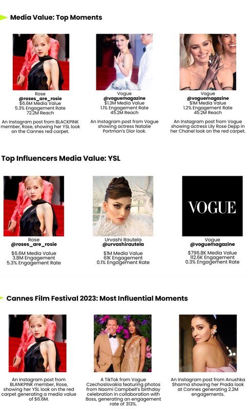 로제의 미디어 가치 성취는 인플루언스 분석 기업인 WeArisma의 보고서에서 밝혀졌어. 그녀의 포스팅에는 멋진 검은색 세인트 로랑 드레스를 입은 사진이 포함되어 있었는데, 이는 브랜드의 우아하고 세련된 느낌을 완벽하게 표현한 거야. 2020년부터 세인트 로랑의 얼굴로 활동하며 로제는 독특한 스타일로 패션계에 꾸준한 감동을 선사해 왔어. 이로 인해 세인트 로랑의 크리에이티브 디렉터인 앤소니 바카렐로로부터 "미래의 세인트 로랑 걸"로 불리기도 했어.