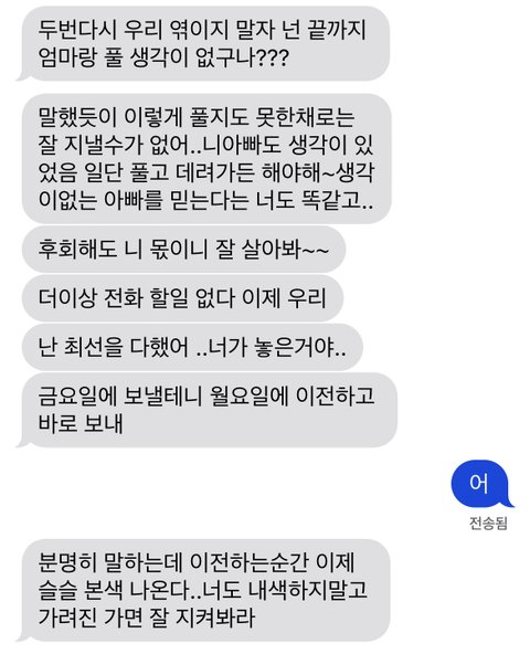 ++) 엄마한테 아빠랑 살겠다고 했는데 엄마가 계속 전학 안 보낸다고 하더라고요. 전화로 싸우다가 법정 얘기 꺼내니 울면서 보낸다고 했습니다 도와주셔서 감사합니다