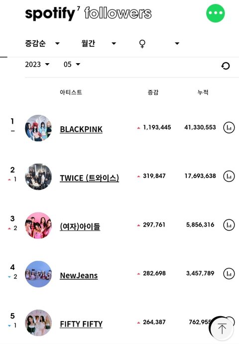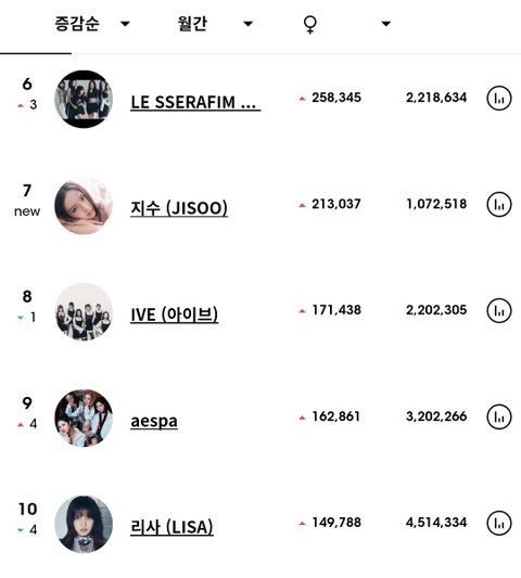 1. 블랙핑크 2. 트와이스 3.(여자)아이들 4.뉴진스 5.피프티피프티 6.르세라핌 7.지수 8.아이브 9.에스파 10.리사