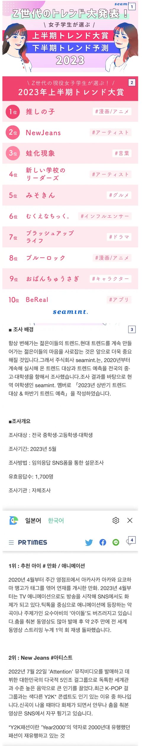 2위 화제성은 뉴진스가 올라왔네. .. 일본10대픽으로