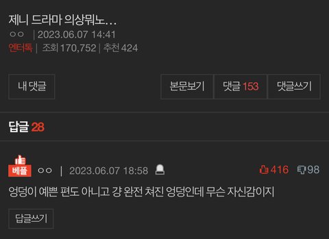 소신발언 : 저 드라마가 여혐이 어쩌고 저쩌고 하기엔 판녀들 여혐이 세상 원탑이신듯 남초한테 여자 품평질하지마라 여돌 성희롱하지마라 ㅈㄹ하면서 정작 본인들이 여돌 몸평 성희롱 조롱에 제일 앞장섬 ㅋㅋ