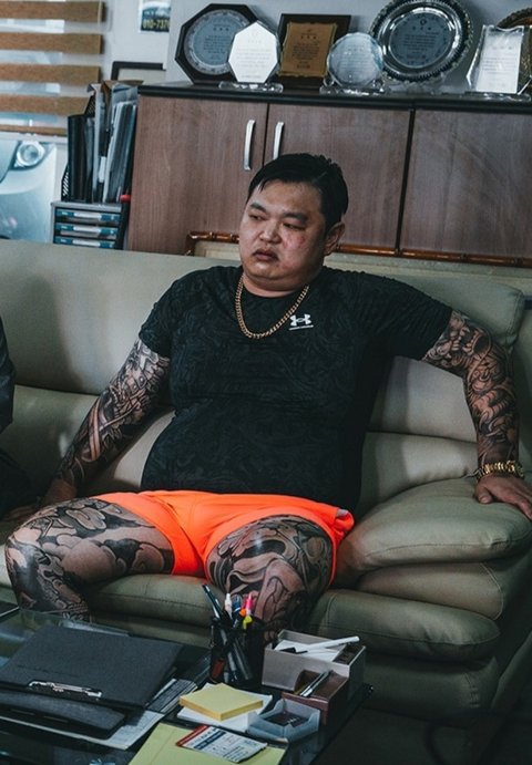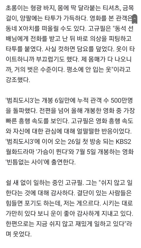 영화에서 형광 바지, 몸에 딱 달라붙는 티셔츠, 타투를 한 고규필은