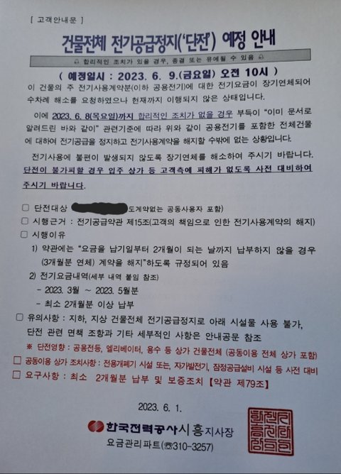 한전에 문의 결과 다음주로 단전이 미루어졌습니다