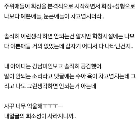 내가 항상 말하지만 남이 고작 성형 한두 곳 한 걸로 본인보다 이뻐졋다는 건... 본인이 그리 이쁜 게 아니란 소리이도다...