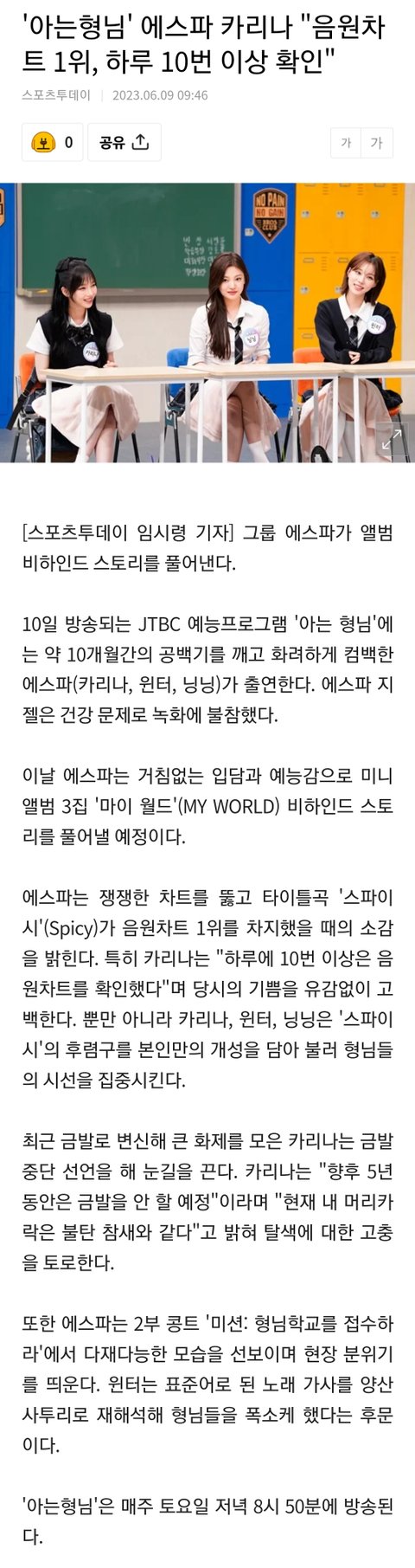 카리나 "음원차트 1위, 하루 10번 이상 확인"