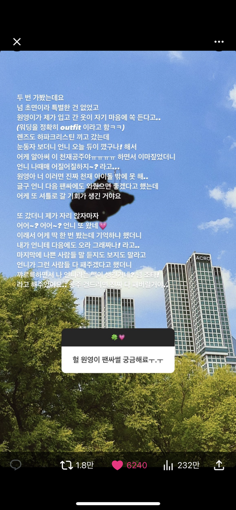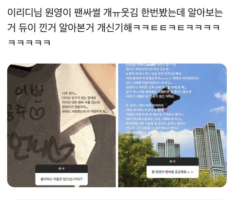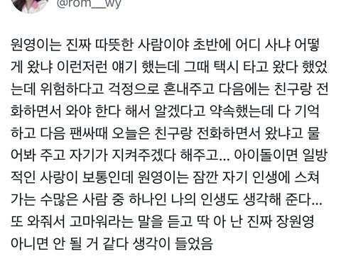 장원영은 진짜 팬들을 좋아하고 아끼고 잘하는 듯 힘든일 생기고 맨날 안티들이 까내려도 단 한번도 티 낸적 없음 심지어 표정도 맨날 웃어주고 팬서비스 맨날 해주고 예쁜 말 만 해주고 근데 팬 한명을 기억해주고 알아봐주고 말 한마디 한마디에 저렇게 예쁘게 말하면 나같아도 좋아할 수 밖에 없을 듯 진짜 아이돌이 팬한테 잘해도 그 사람을 기억하긴 힘든데 천상 아이돌 천상 연예인인듯...