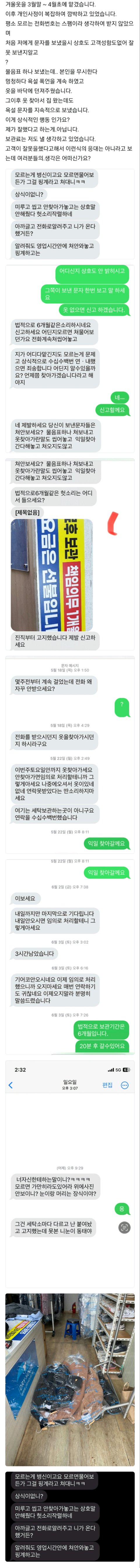 고객이 제정신이 아니네요. 세탁소 연락 계속 무시하다가 익일 찾으러 간다고 해놓고 찾으러 안 가고 저 정도면 세탁소에서 옷 버려도 할 말 없어야지 뭘 잘했다고 법 타령이나 하고 글까지 올린대요?