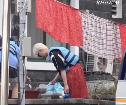백금발 썬글라스 구명조끼 빨강치마 장미꽃
