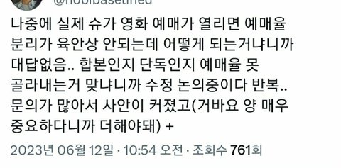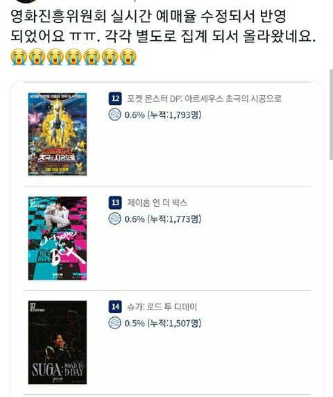 각각 실적이 따로집계되거나 공동 상영 실적이 통합코드에 집계되는게 아니라 윤기 다큐 실적에 몰빵되서 문제였는데 다시 따로 집계로 수정됐나봐