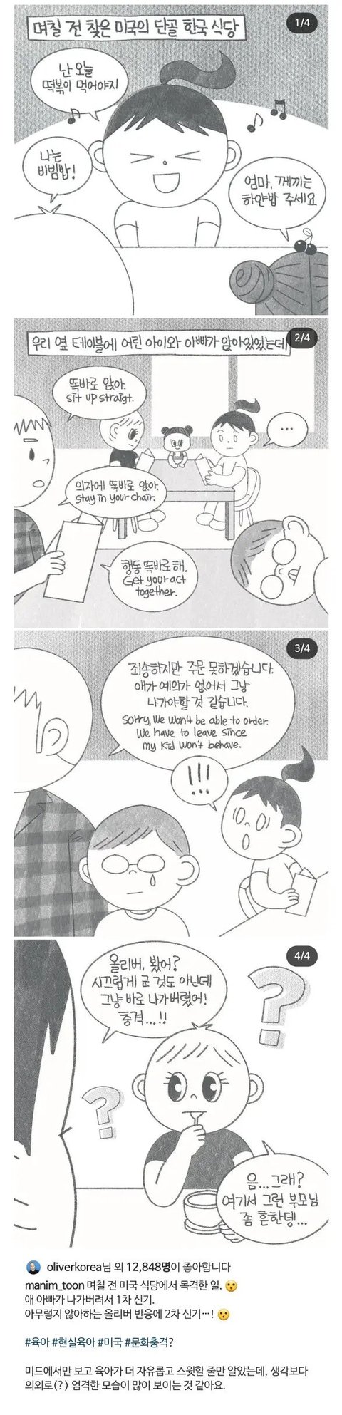 행동으로 안보여주면 애들이 부모가 장난치는 줄 앎. 막 소리지르면서 혼내거나, 안절부절 제발 조용하라고 애원할 필요없이 조용히 있지않으면 우린 집으로 가야해 경고주고 안지켜지면 우린 주위사람한테 폐끼쳐서 집에 가야돼 하고 일어나면 됨ㅋㅋ애들 울고불고해도 그냥 애 집어들고 바로 집ㄱㄱ하면 그담엔 그정도로 안까붐. 경고도 곧장 먹힘. 보통 부모들이 어쩌다 한 번 나온 외출, 마음먹고 나온 외출이라 머뭇하는건데 집 가까운 곳에서부터 가르치면됨