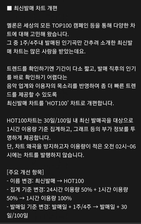 기존 최신발매곡 대상으로 1주및4주 최신히트순위라고 24시간50%와 실시간50%합산 반영하던걸 없애고