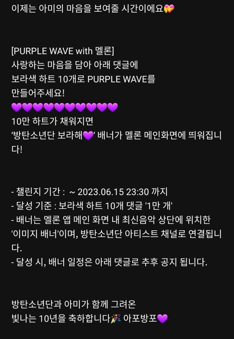 멜론에서 저기 방탄소년단 와글와글 톡에 보라색 하트 10개 댓글 만개 넘어가면 멜론 메인에 배너 달아준대 아래 링크 가서 댓글에 보라색 하트 10개 달아주라