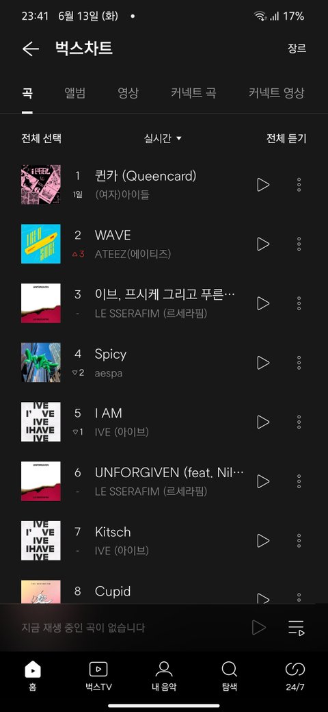 아무리 밤+벅스라지만 11시대에 아이들, 르세라핌, 에스파, 아이브 사이에서 계속 2위 유지중임(활동기X, 기념일 스밍총공X, 이제껏 어떤 플랫폼이든 저정도로 든 적 없고 해외팬들이 컴백 대비해서 스밍 연습해본다고 저렇게 된 거)