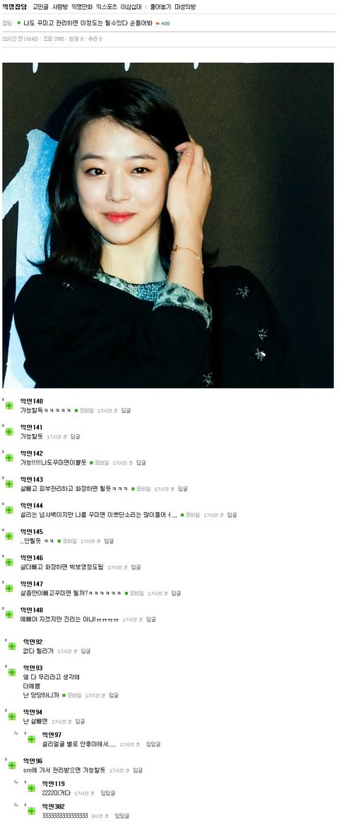 연예인 관리받으면 나도 연예인될거다, 데뷔 할 수 있다 이게 아니라, 외모 포텐을 전부 끌어다 올려주는 메이크업이나 관리 받아보고 싶다. 이런게 대부분 이런 글들의 의도일텐데 이런 글이나 댓글마저도 불편해서 베플조작 하는건 참... 안쓰럽네 판녀한테 얼마나 한을처먹었으면 무작정 판녀 까는 댓글만 주작하는건지